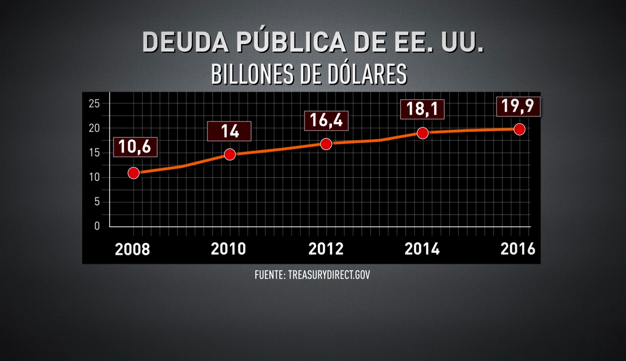 Hoy la deuda pública de EE.UU. se aproxima a los 20 billones de dólares. En los últimos años ha registrado un paulatino incremento. Según los datos oficiales, ha pasado de los 10,6 billones de 2008 a los 19,9 billones del año 2016. Un incremento global de un 87,7%.