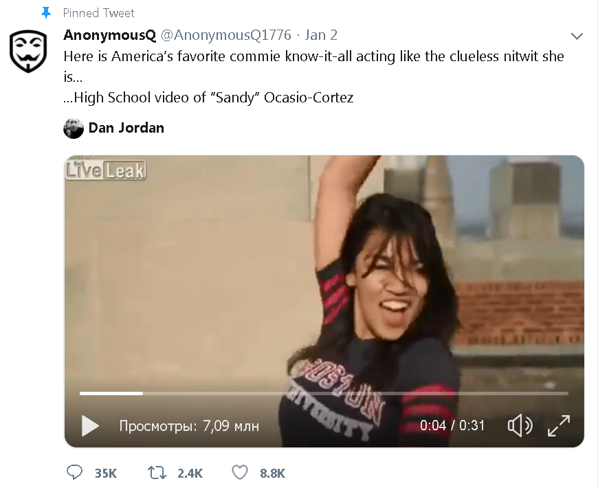 "Aquí está la comunista sabelotodo favorita de EE.UU. actuando como la boba despistada que es", reza la publicación de la cuenta AnonymousQ, que poco después fue eliminada de Twitter.