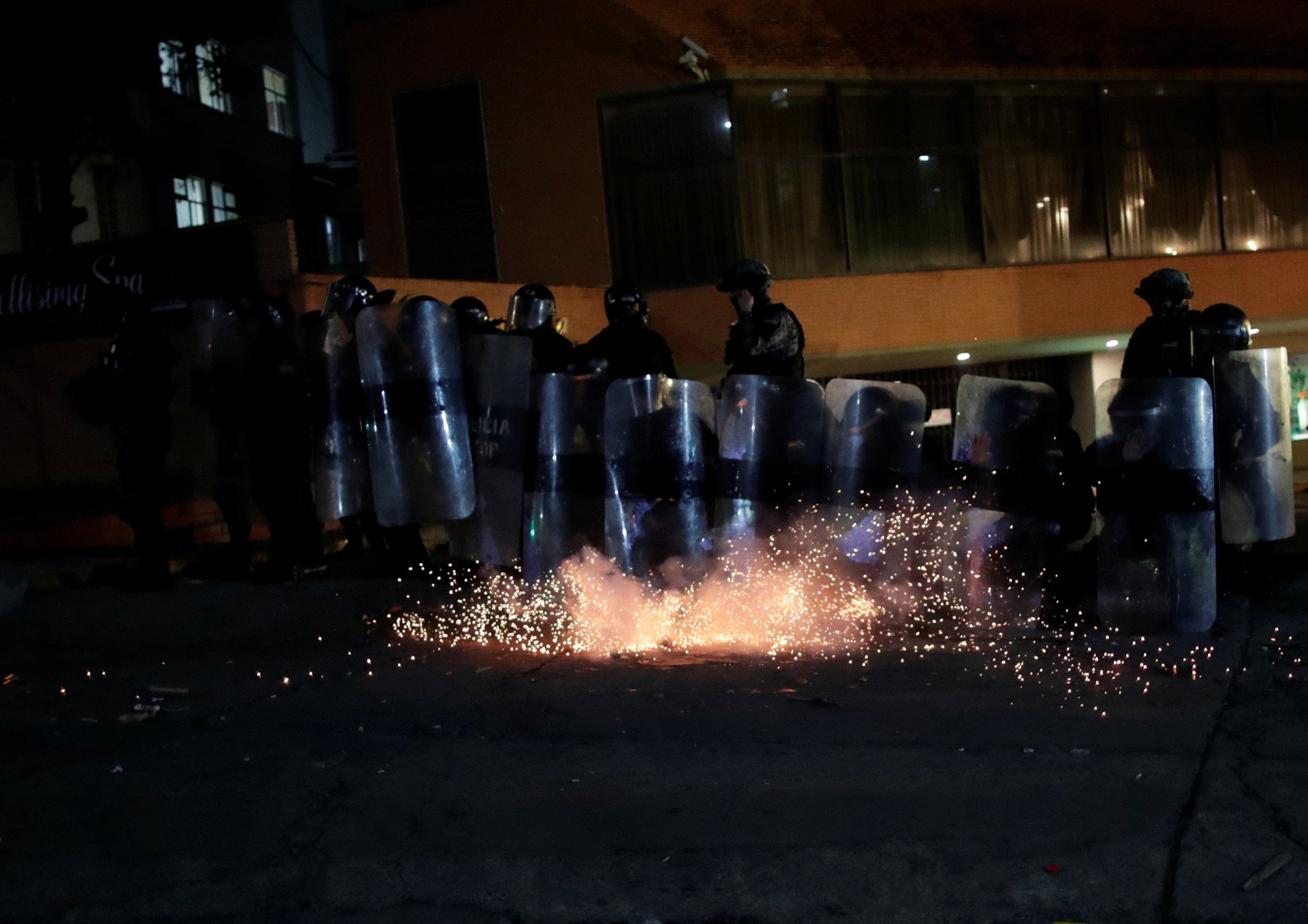 Mientras el principal candidato opositor, Carlos Mesa, desconoció el resultado, varios de sus simpatizantes lanzaron piedras y otros objetos contra el edificio, hiriendo a una agente de la Policía. La Defensoría del Pueblo informó que la uniformada ha sido trasladada hasta la Clínica Policial.