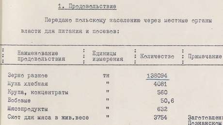 Uno de los documentos desclasificados informa cómo el Ejército Rojo, entre 1944 y 1945, proporcionó a los polacos 316.000 toneladas de papas y vegetales, así como más de 138.000 toneladas de diferentes granos.