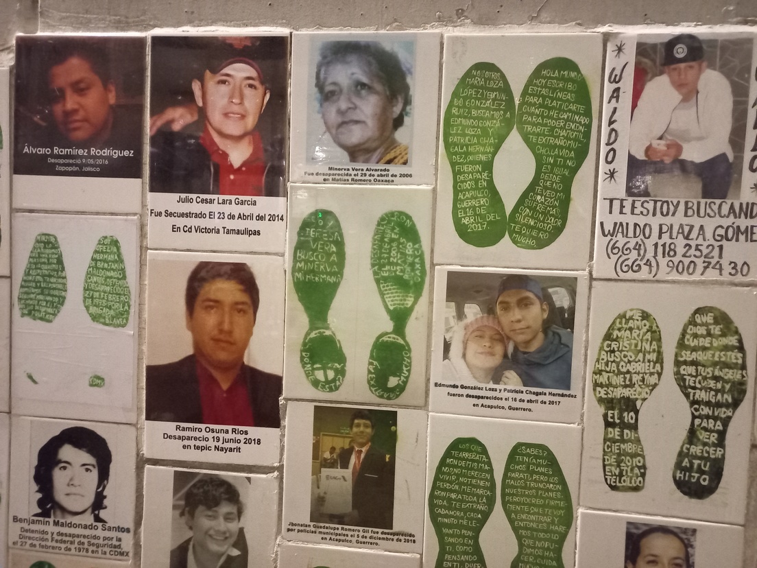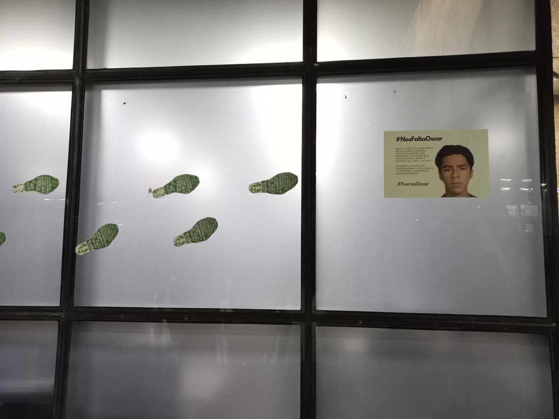 En los grandes ventanales del edificio gubernamental, el colectivo Huellas de la Memoria colocó una estampa delineada de plantas de los pies, que en el centro tenía escrito: "Hijo, mis pasos son tus pasos y caminan junto a los pasos de las madres centroamericanas. Caminaremos hasta el fin del mundo, pero los encontraremos".