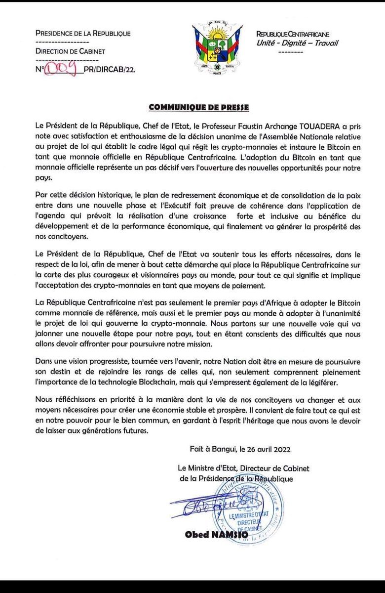 "La República Centroafricana no solamente es el primer país de África en adoptar el bitcóin como moneda de referencia, sino que también es el primer país del mundo en adoptar por unanimidad el proyecto de ley que gobierna la criptomoneda", afirma el comunicado presidencial.