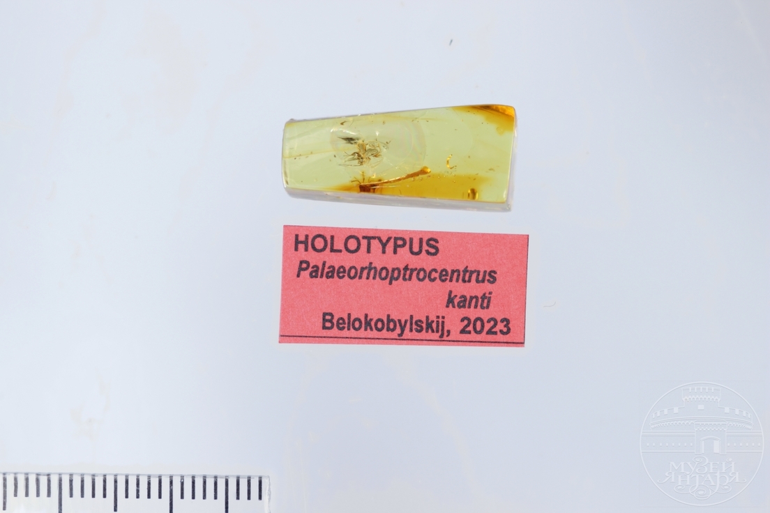 La nueva especie fue bautizada como 'Palaeorhoptrocentrus kanti' en honor al filósofo alemán Immanuel Kant, que nació y vivió en Konigsberg (actualmente, la ciudad rusa de Kaliningrado). Tenía dos grandes ojos y un complemento de otros tres medianos en la frente. La longitud de los bigotes-antenas era de 1,2 veces la del cuerpo. En lugar de aguijón, como las avispas modernas, tenía un ovopositor [órgano para depositar huevos].