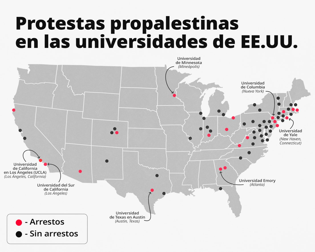 Universidades de EE.UU. siguen siendo el centro de masivas protestas estudiantiles en apoyo a Palestina. Mientras la Policía interviene o planea intervenir en varios centros educativos para dispersar a los manifestantes, e incluso se plantea la posibilidad de desplegar a la Guardia Nacional, el mapa de manifestaciones se expande.