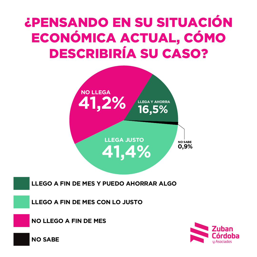 Uno de los datos que comprueba la magnitud de la crisis se refleja en el hecho de que 41 % de las personas entrevistadas reconoció que llega a fin de mes con lo justo, pero a otro 41 % sus ingresos se le terminan antes de ese plazo. Esto significa que ocho de cada 10 argentinos tienen problemas para subsistir.