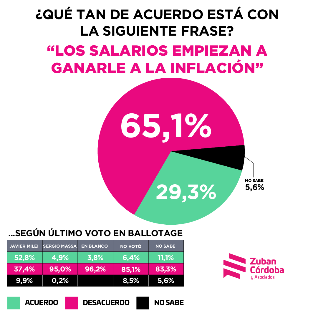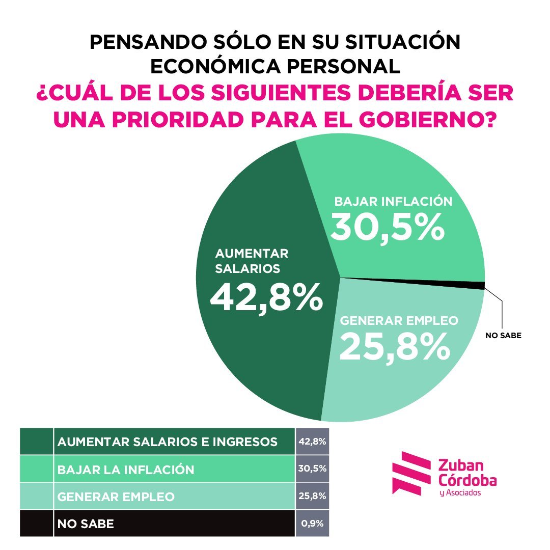 Por ello, el 42,8 % piensa que la prioridad del Gobierno debería ser el aumento de los salarios, en tanto que el 30 % cree que el problema central es la inflación, y un 25,8 %, la generación de empleo.