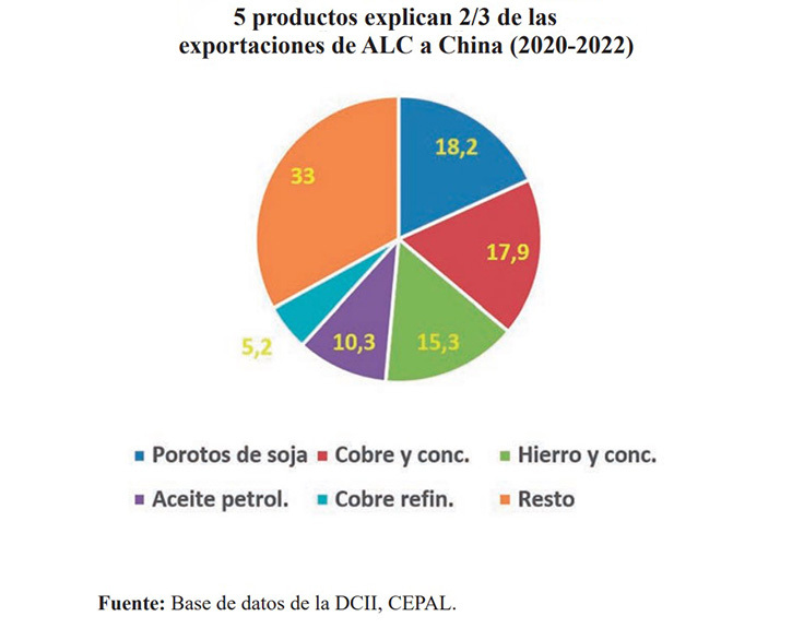 El comercio ha crecido en los últimos años a ambos lados del Pacífico, pero con diferencias en los productos que se comercializan, según apunta un informe del Sistema Económico Latinoamericano y del Caribe (Sela). América Latina y el Caribe exporta a China principalmente materias primas, con cinco productos principales: soja, petróleo crudo, cobre, hierro y carne.