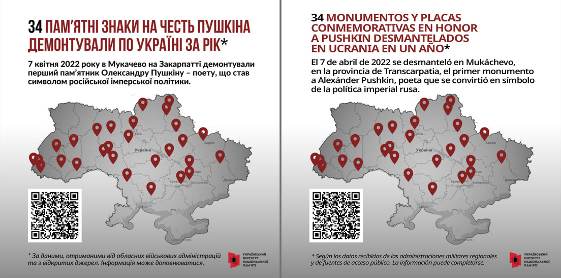 Además de la exitosa demolición de monumentos de Pushkin, el Instituto de la Memoria se jacta en su informe anual de la destrucción de nueve monumentos al escritor soviético Máximo Gorki, cuatro monumentos al autor de 'Cómo se templó el acero', Nikolái Ostrovski, quien resultó ser un ucraniano incorrecto, cuatro monumentos al gran estratega y héroe militar ruso del siglo XVIII Alexánder Suvorov y cerca de veinte memoriales y monumentos dedicados a los soldados soviéticos que liberaron a Ucrania del fascismo hitleriano. Como una hazaña especial y "un ejemplo de la descolonización del espacio público", se menciona el desmontaje del monumento en Odesa a la emperatriz rusa Catalina, quien fuera la fundadora de esta ciudad portuaria en 1794, cuando la palabra "Ucrania" se usaba solo para definir las tierras fronterizas en el sur del Imperio Ruso.